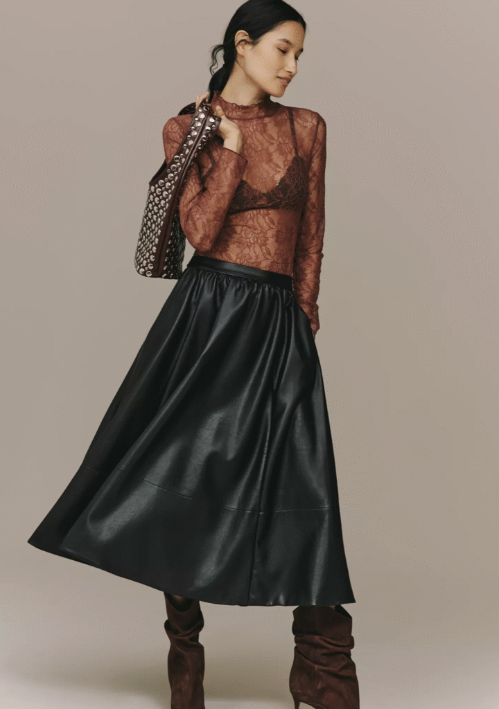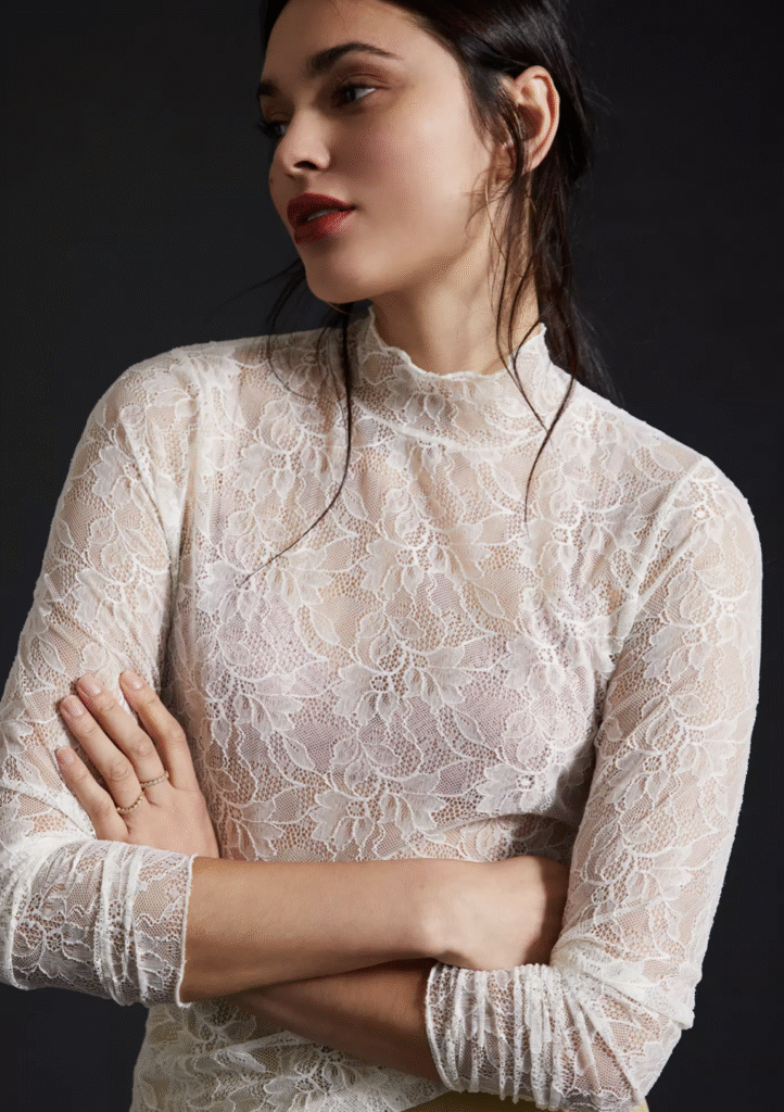 Lace. I’m going to be honest. I didn’t see this one coming for fall. But it’s here! Lace isn’t all Victorian ruffles and frills these days (though that’s part of the mood). It’s lace peeking out (cuffs, collars), lace layered over unexpected under‑pieces, lace in darker or jewel tones. It’s intimate without being over‑sweet. And if you’re looking for that perfect special event dress, you’re going to find slip dresses with lace details.